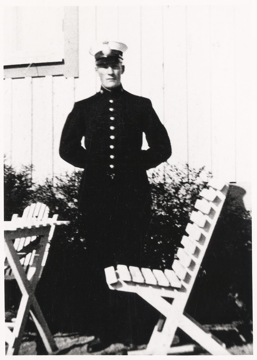 Fjärdingsman Eric Ström i en trädgård i Räppe, ca 1943.