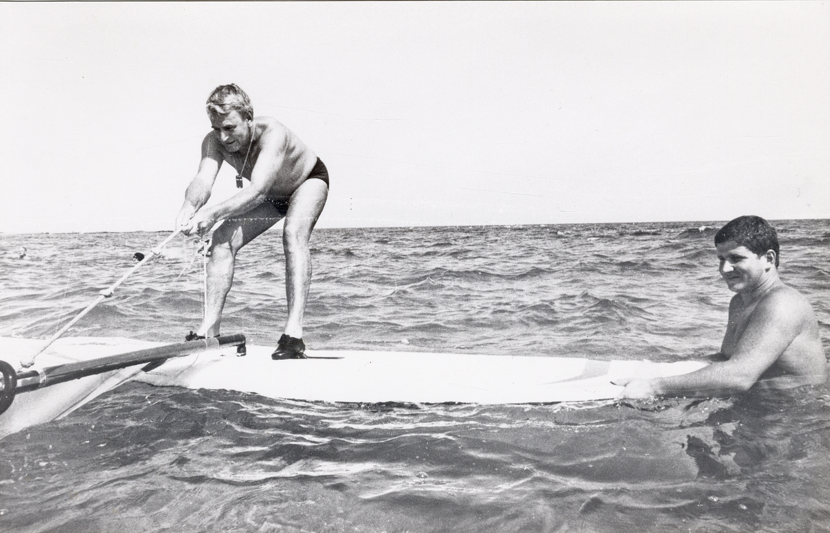 Dåv. överstelöjtnant Leif Fransson t.v., övar vindsurfing.