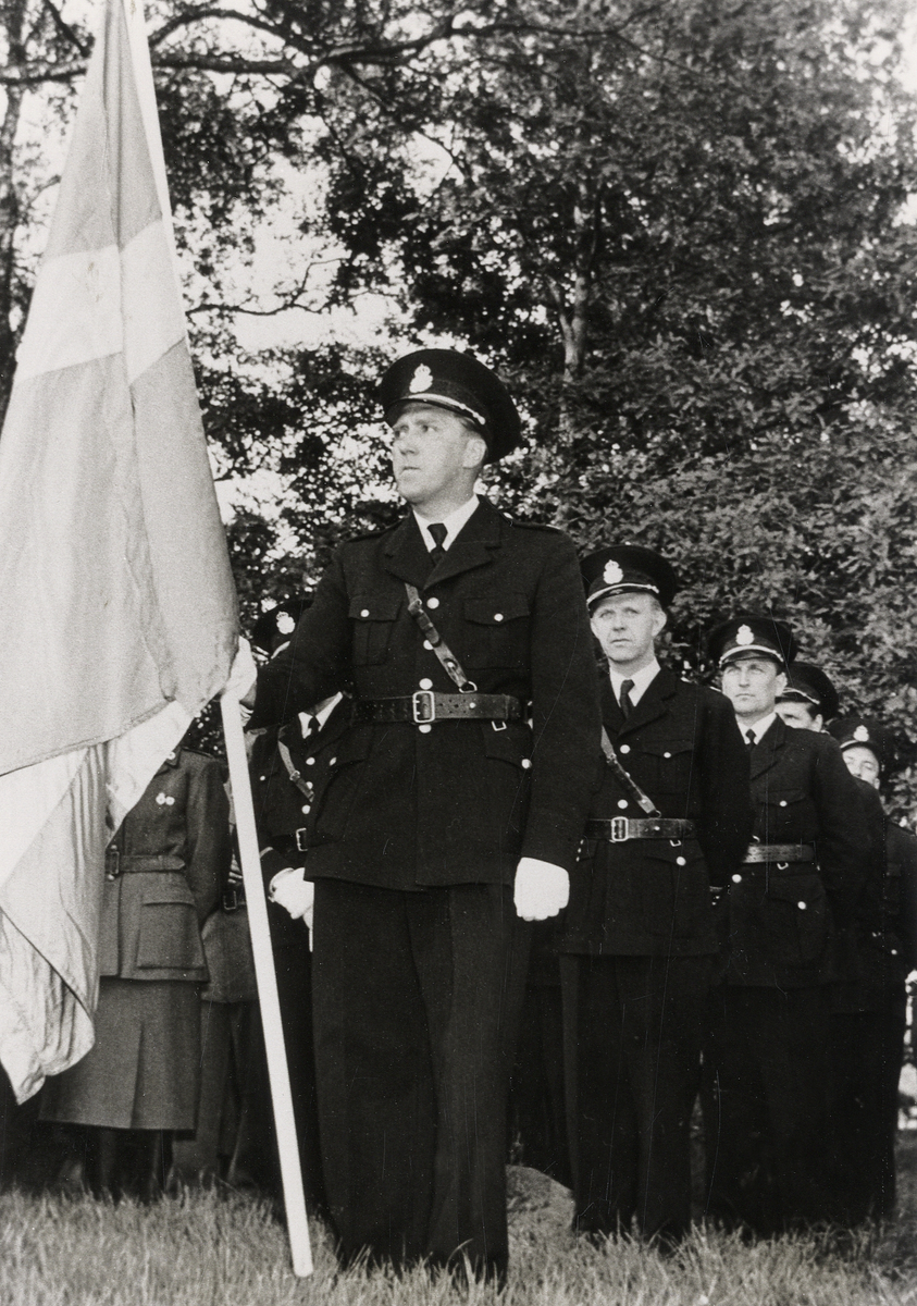 Till vänster skymtar en lotta i uniform, bakom fanan.