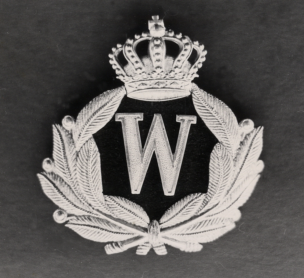Mössmärke i mässing. "W" (Wexiö) , på svart tyg.