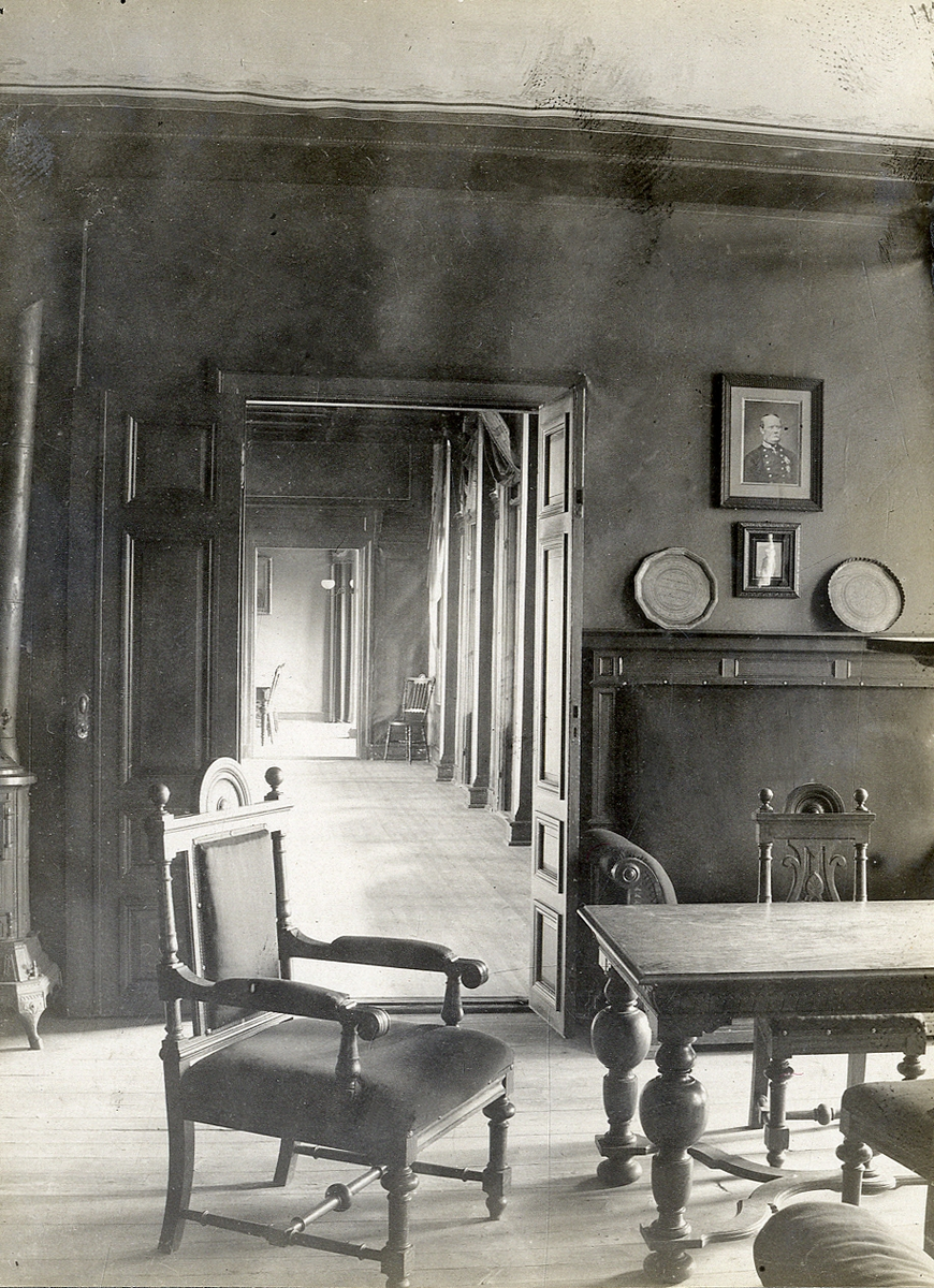 Röda rummet (och en del av matsalen) i Officersborgen. På väggen syns bl a ett litograferat porträtt av överstelöjtnant Eric Magnus af Klint.