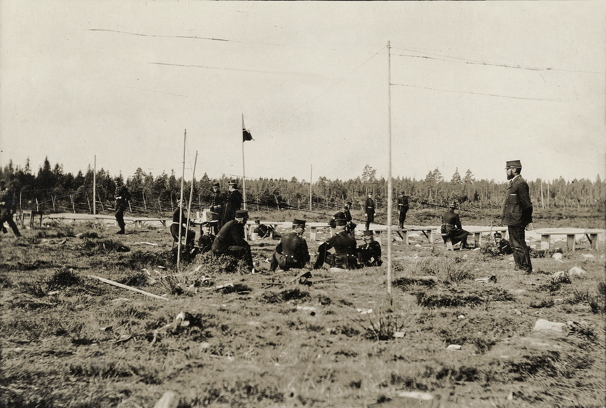 På skjutbanan. Sittande vid telefonbordet: löjtnant C von Platen. Längst till höger gevärshantverkaren Rydén.