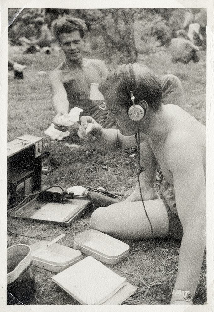 Två man i badbyxor sköter radiotjänsten, samtidigt som de äter och njuter av det soliga vädret.