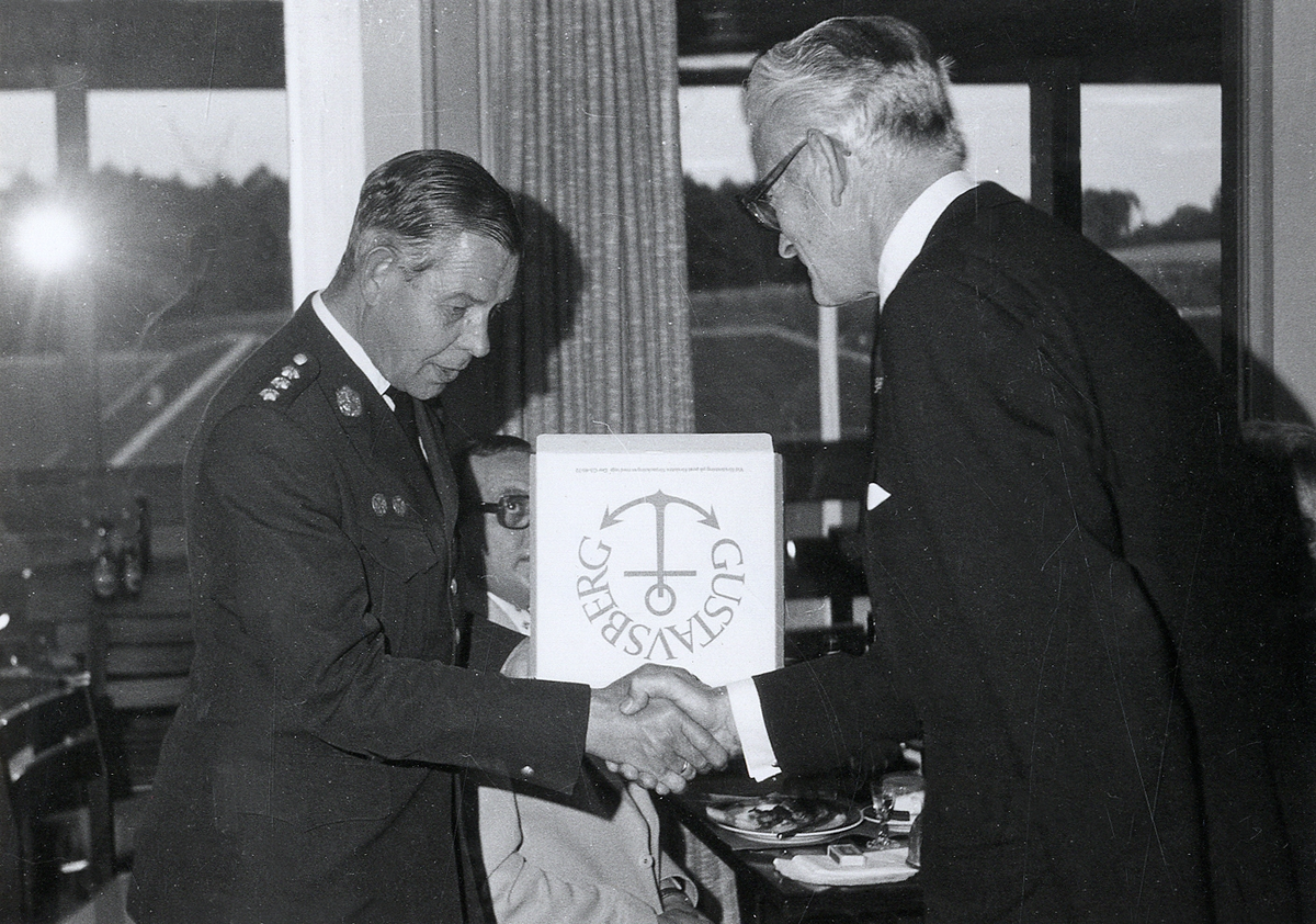Överste Flemming Freiesleben mottar regementets jubileumstallrik som minne, av överste Per Hugo Winberg.