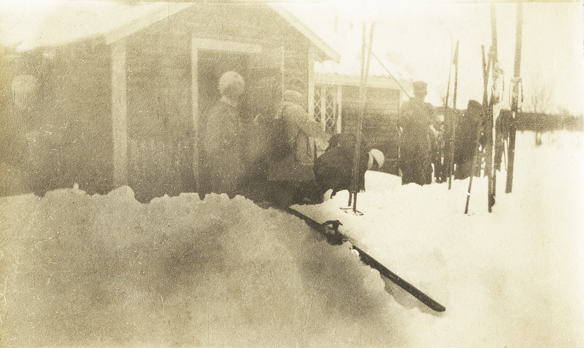 En stuga med några officerare framför, som inspekterar sina skidor i snön.