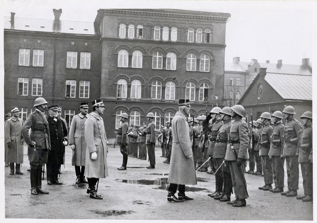 Bakom kungen syns hans sonson, prins Gustaf Adolf och bakom honom bataljonschefen, överstelöjtnant Nordenswan (i hjälm).