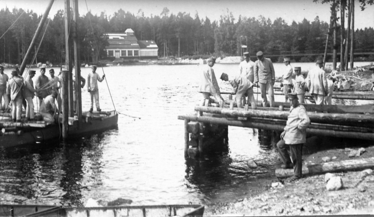 Svea ingenjörkår, Ing 1. Övningsplatsen Laxön. Fältbroarbeten vid Sydkap. Byggnaden "Hallen" i bakgrunden.