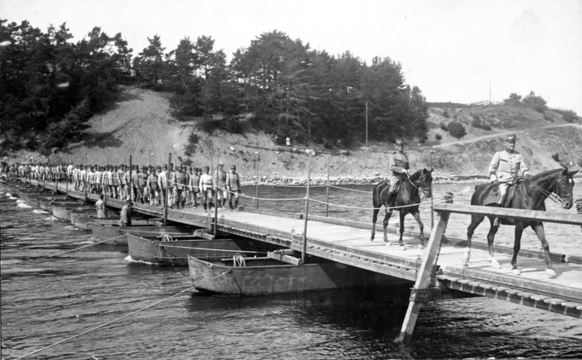 Svea ingenjörkår, Ing 1. Övningsplatsen Laxön. Flytande krigsbro över Dalälven vid Sand.