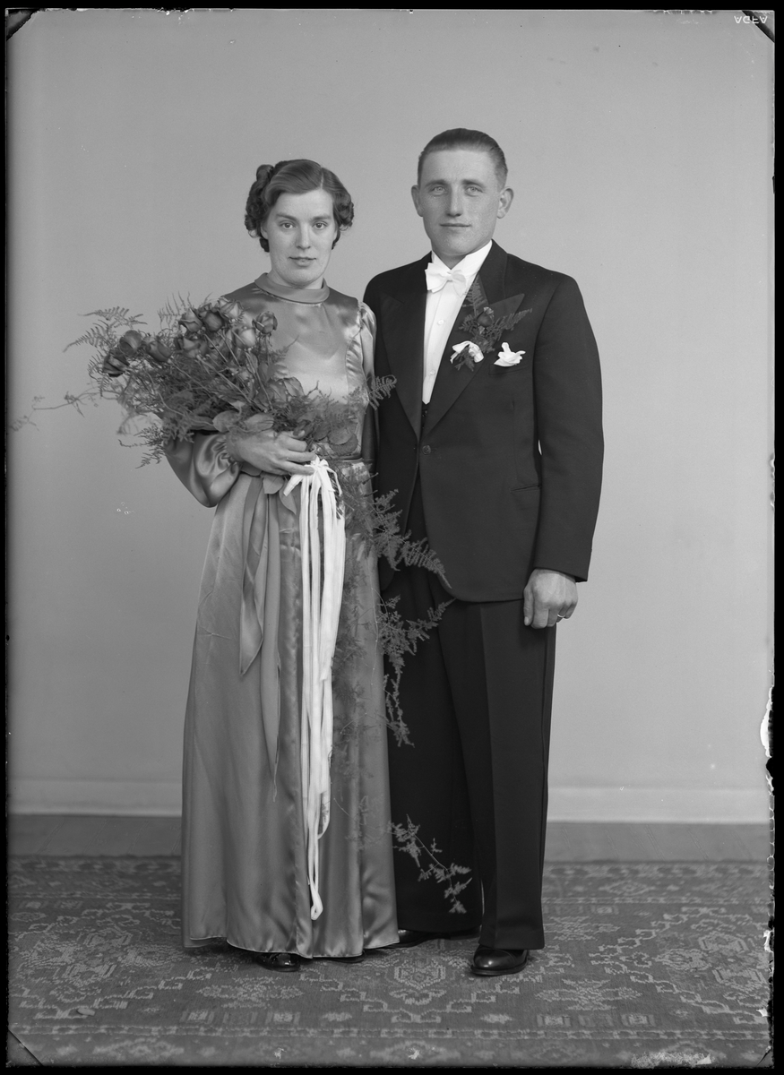 Bröllopsporträtt, brudpar. Gunnar Fredriksson, Kvalsta, Berg, Hallstahammar.
