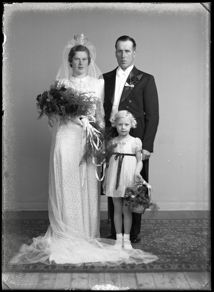 Brudpar och brudtärna. Sigurd Käck, Hässelby, Strömsholm.