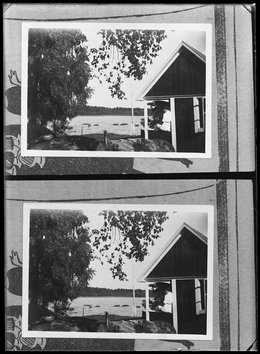 Husgavel och vy över vatten (reproduktion). Fröken Lundqvist, Posten.