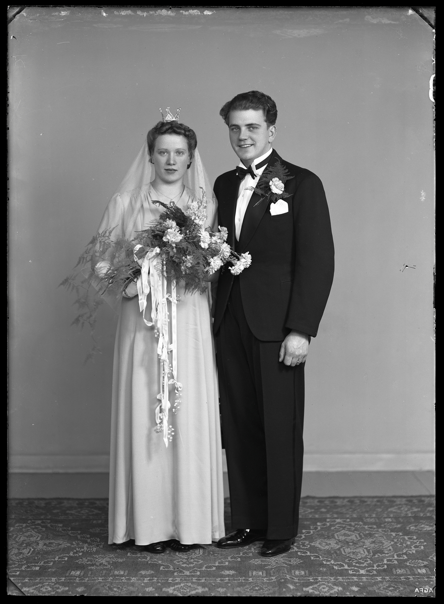 Grupporträtt, brudpar. Sune Andersson, Frössvi, Berg, Hallstahammar.