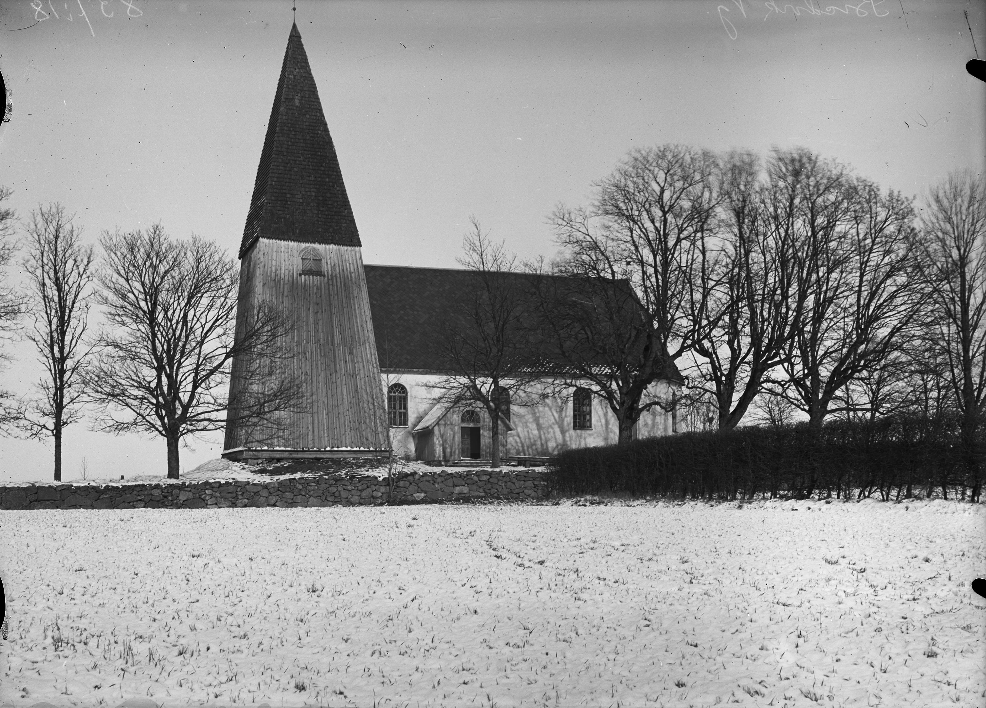 Kyrkan och klockstapeln från söder.