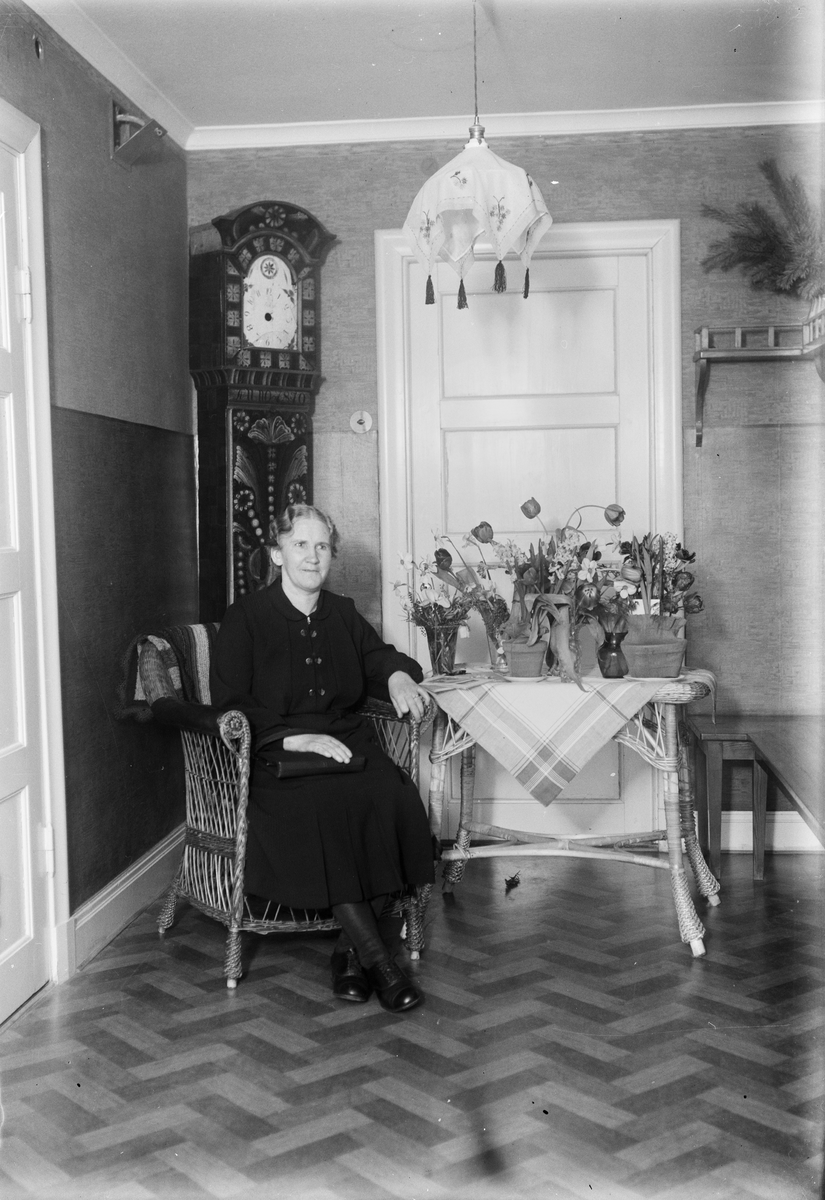 Kvinna sitter vid bord med blommor, Alunda, Uppland