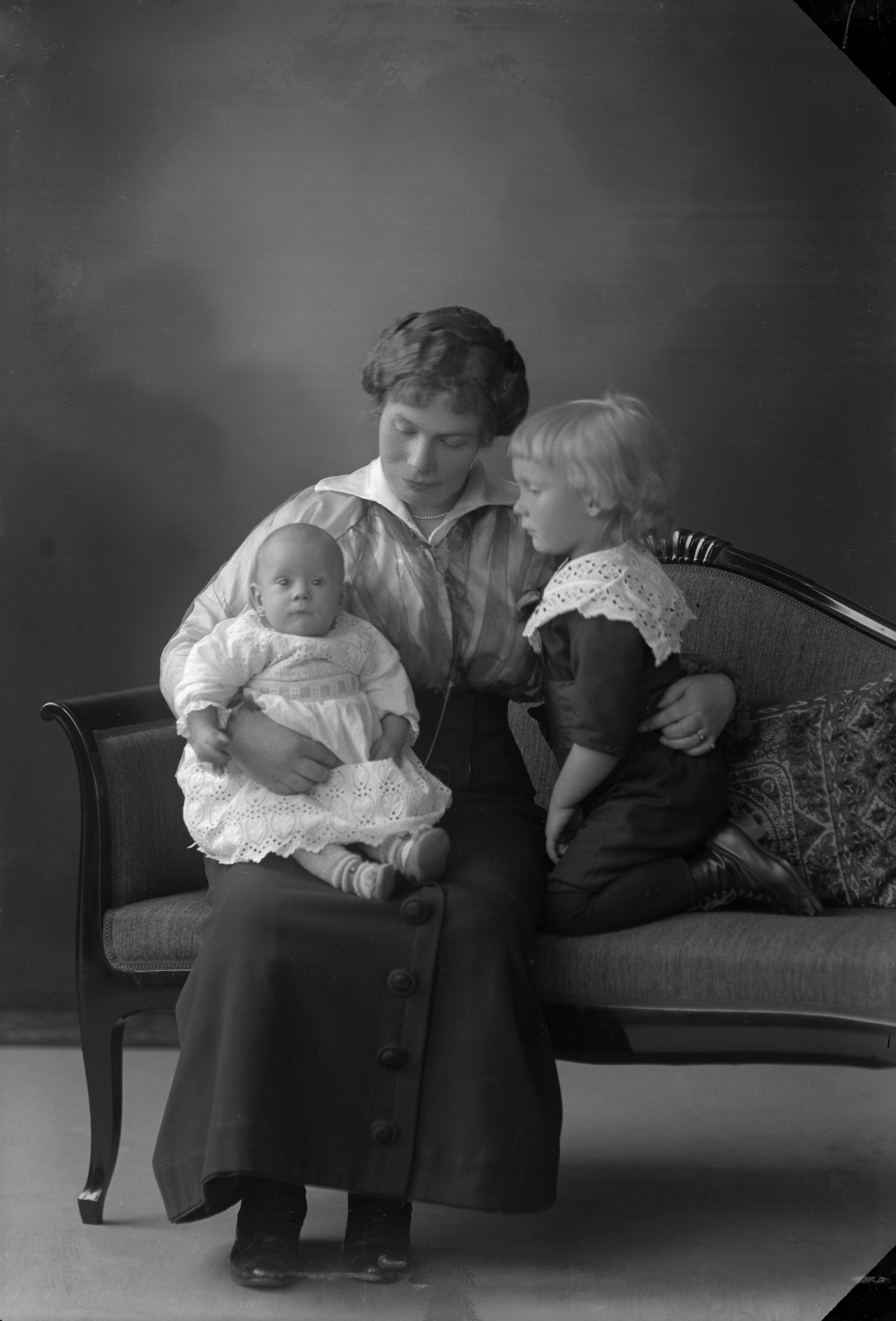 Porträtt i helfigur av Agda Maria Werder med sina barn, Börje och Gulli, sittande på soffa. Modern är syster till tapetseraren Gusta Bielstéen (1850-1921).