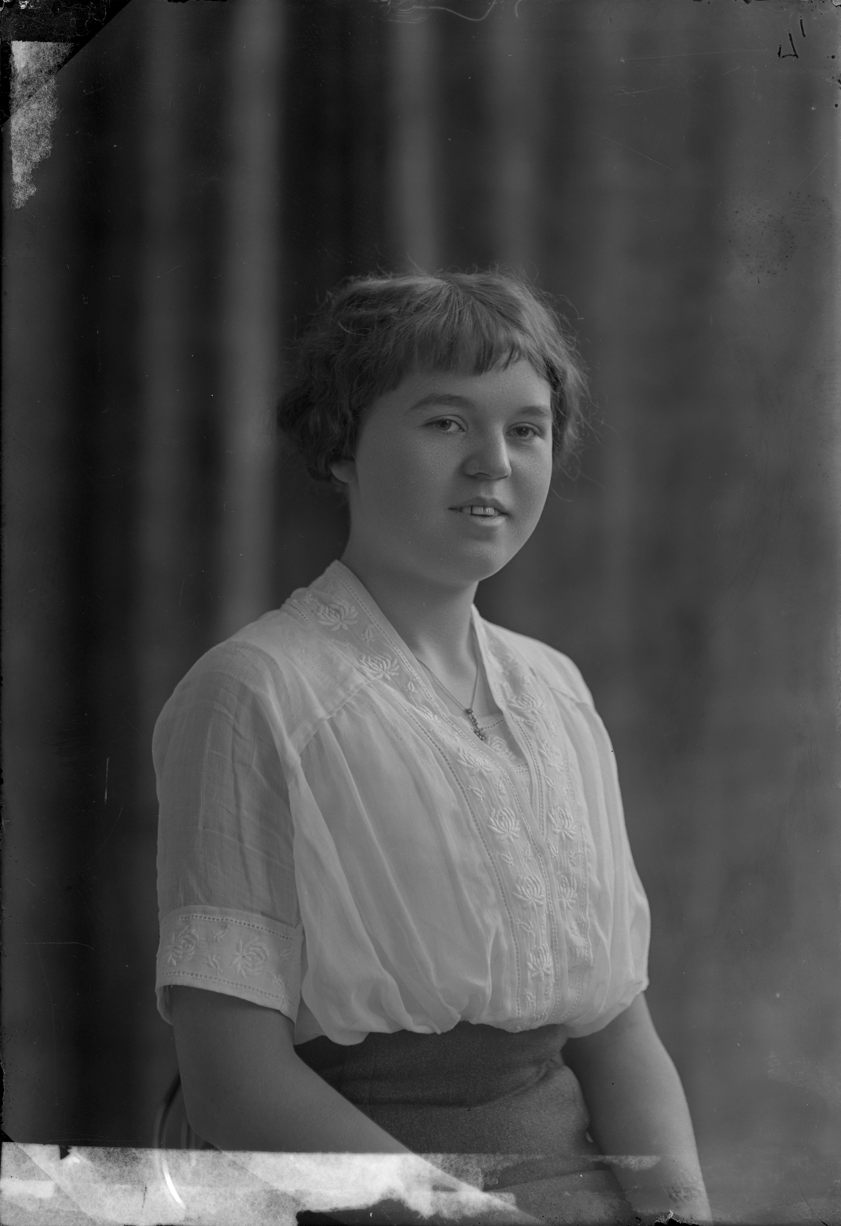 Beskrivning: Porträtt i halvfigur av Karin Hildebrand.