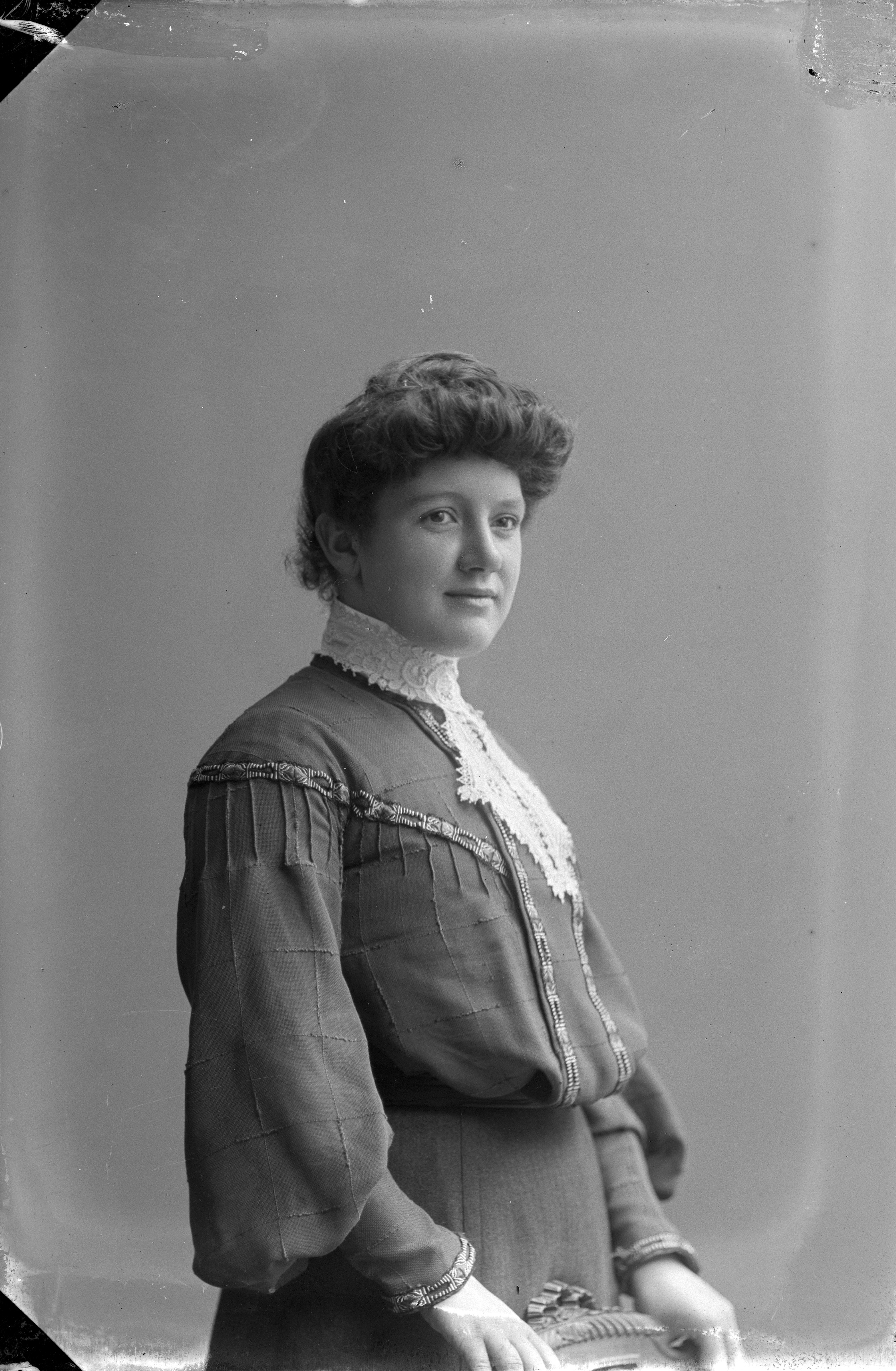 Beskrivning: Porträtt i halvfigur av Ida Jönsson i blus med hög spetskrage.