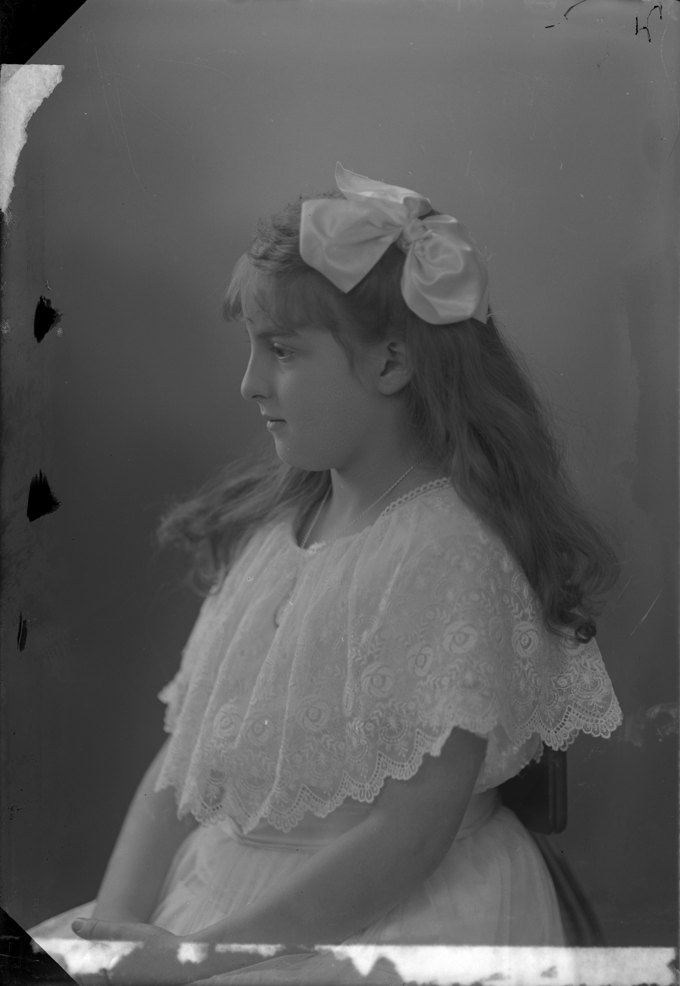 Beskrivning: Porträtt i halvfigur av Sonja Andersson med rosett i håret.