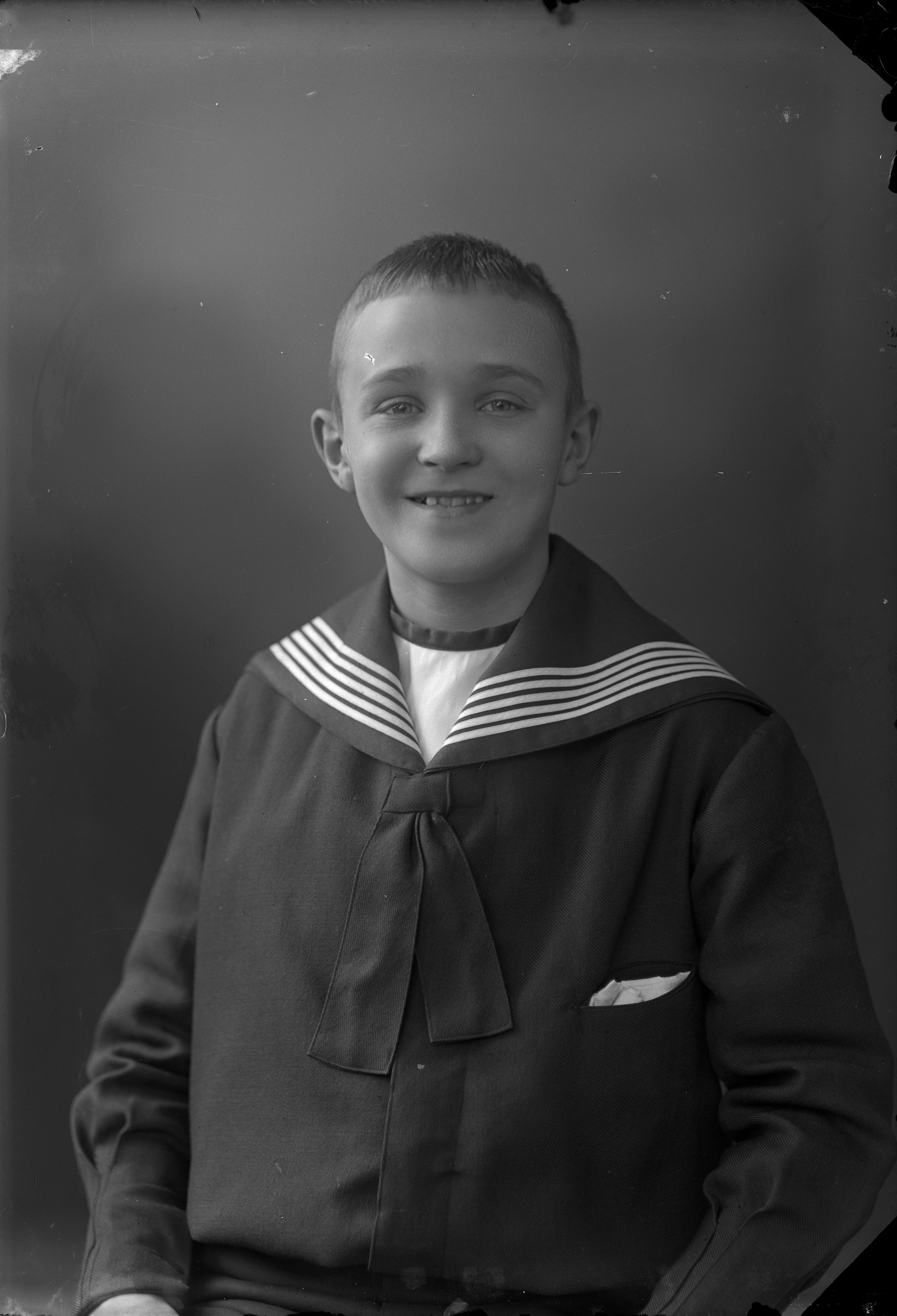 Porträtt i halvfigur av E. Svenssons son, iklädd sjömanskostym.