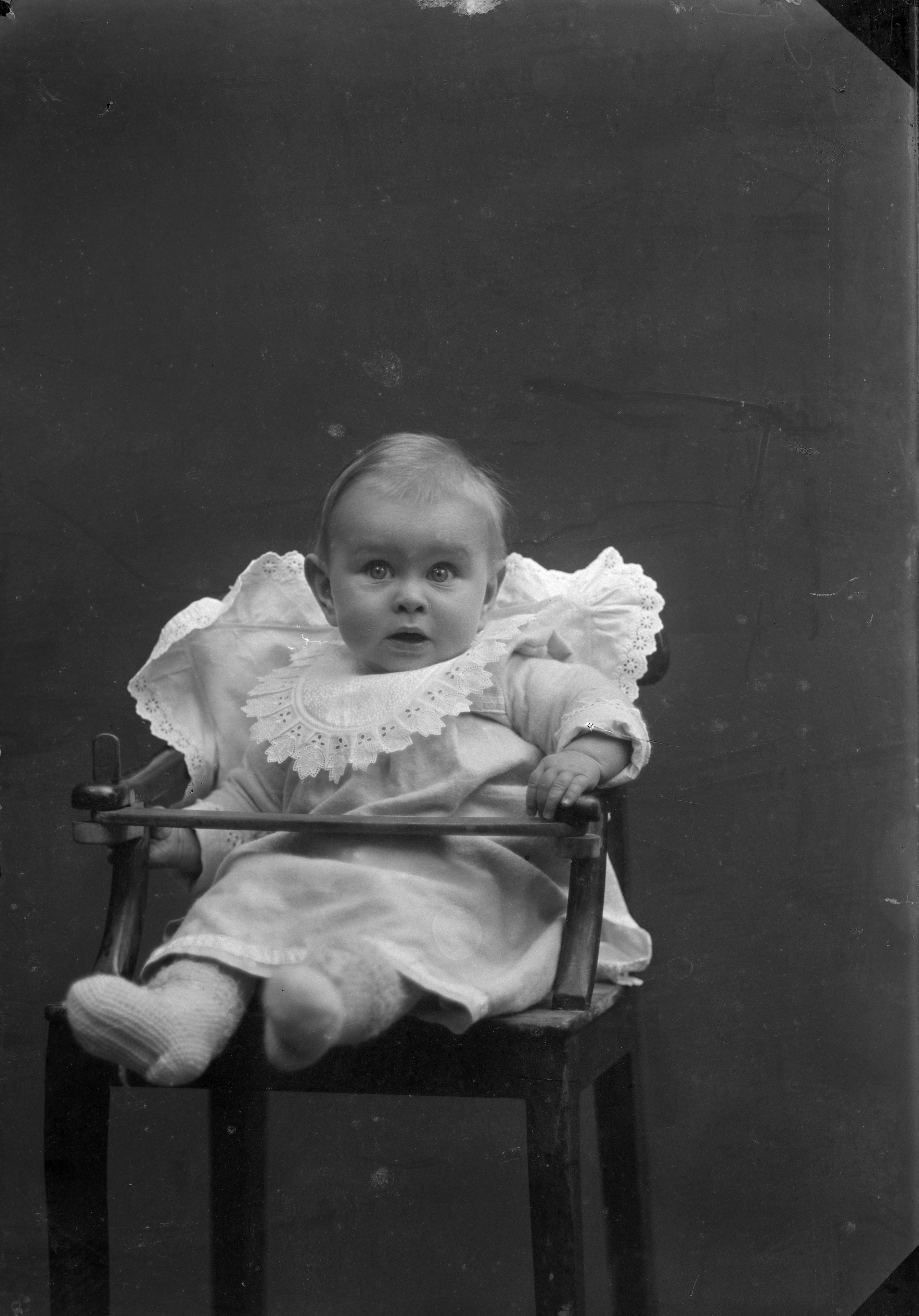 Porträtt i helfigur av Lindströms barn, sittande i barnstol.