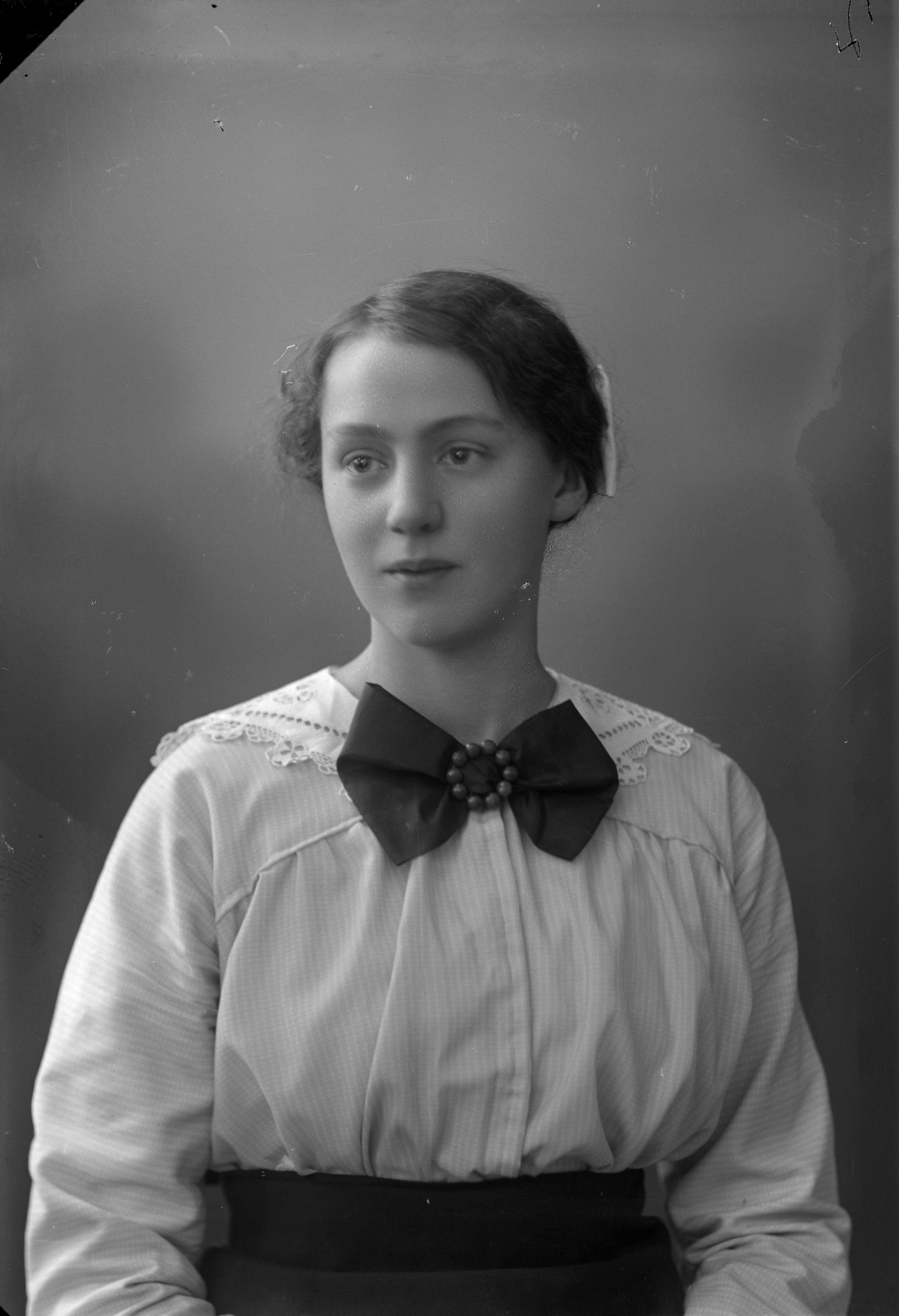 Porträtt i halvfigur av Bertha Mårtensson bärande brosch och blus med platt, mörk rosett.