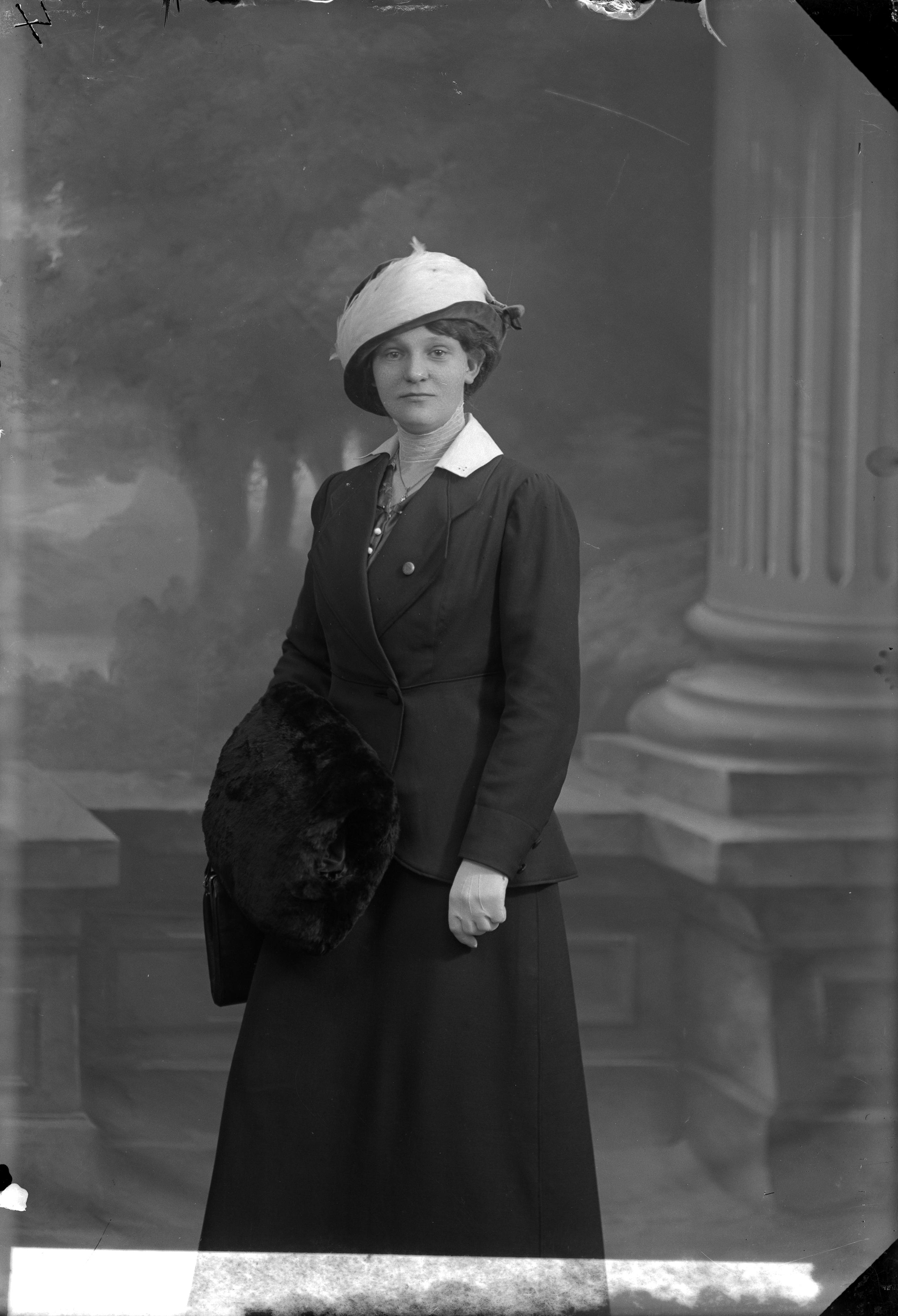 Porträtt i helfigur av Ida Friman. Hon bär hatt och kappa, fondvägg med pelar- och parkmiljö utgör bakgrunden.