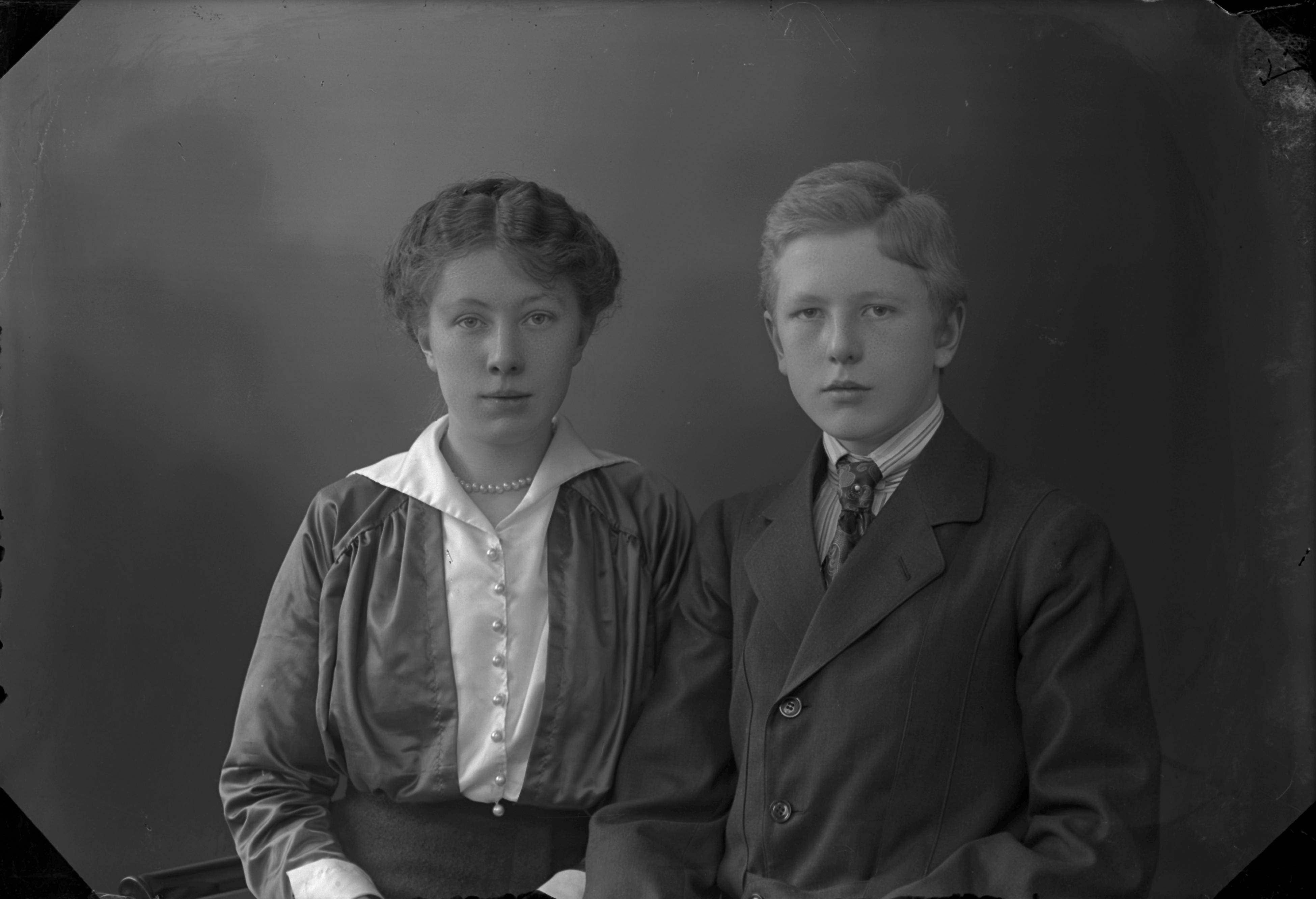 Porträtt i halvfigur av Ninni Malmström med okänd yngre man, möjligen broder.
