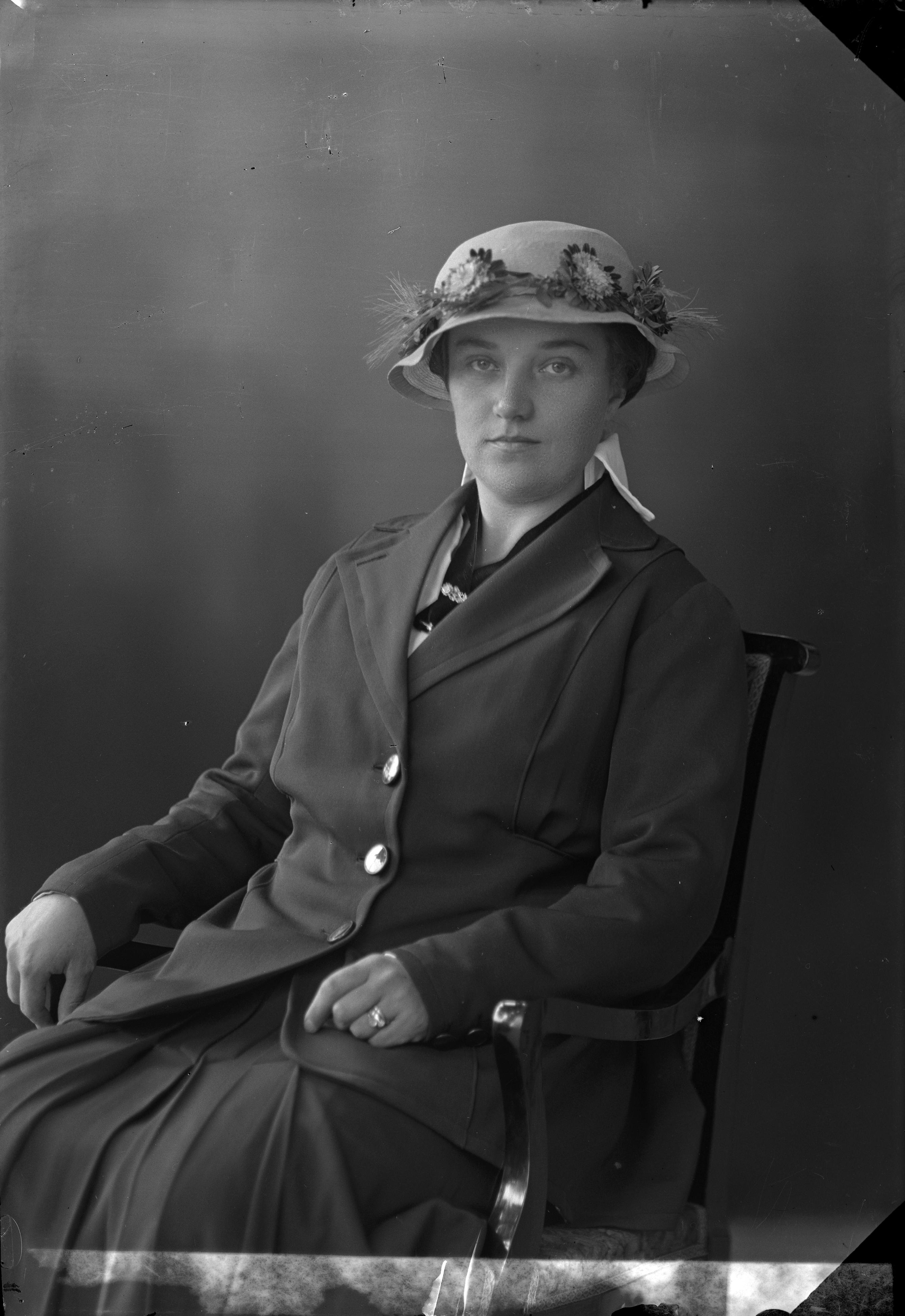 Porträtt i helfigur av fru Trädgårdh, sittande i stol.