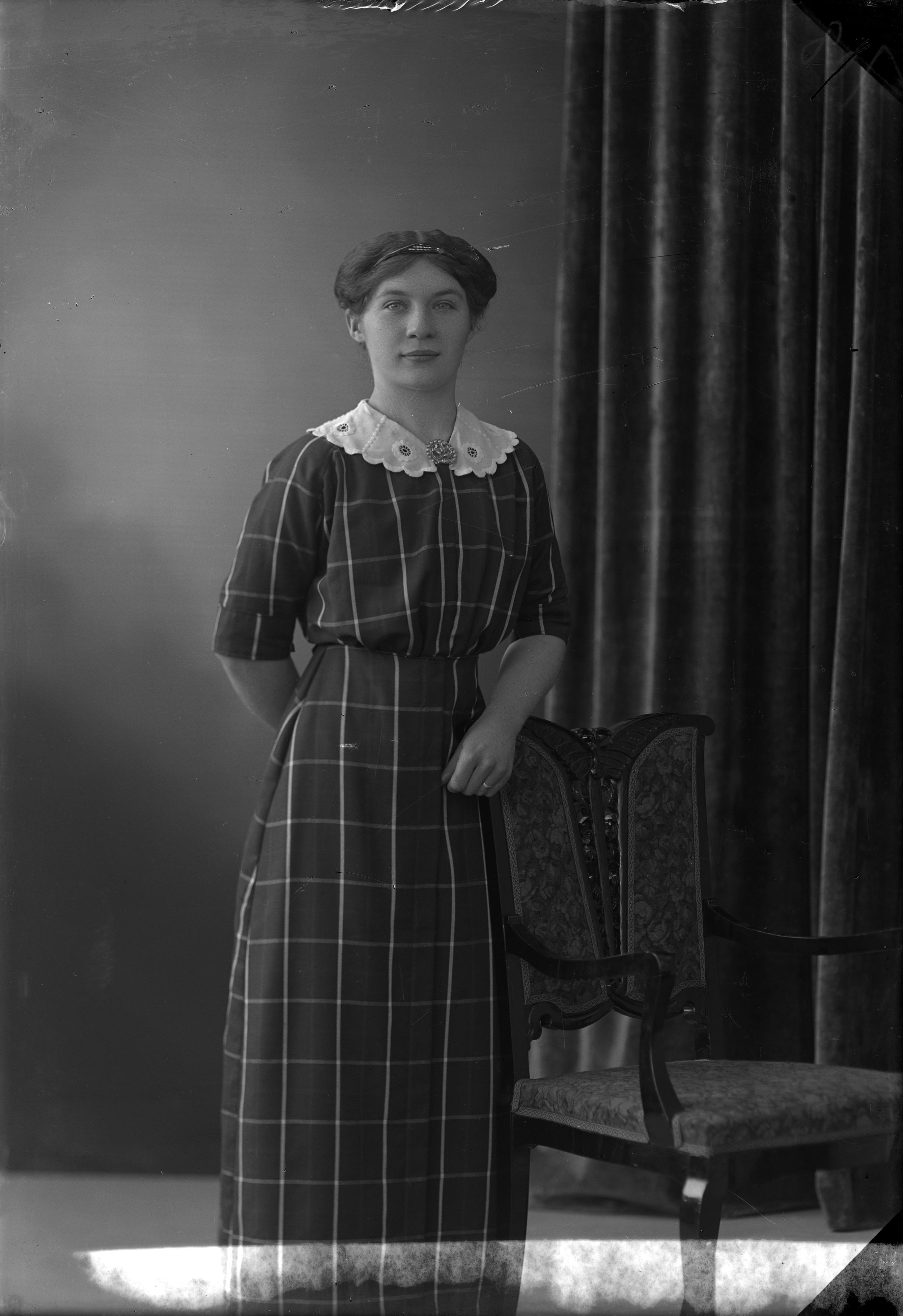 Porträtt i helfigur av Betty Andersson, stående vid stol.