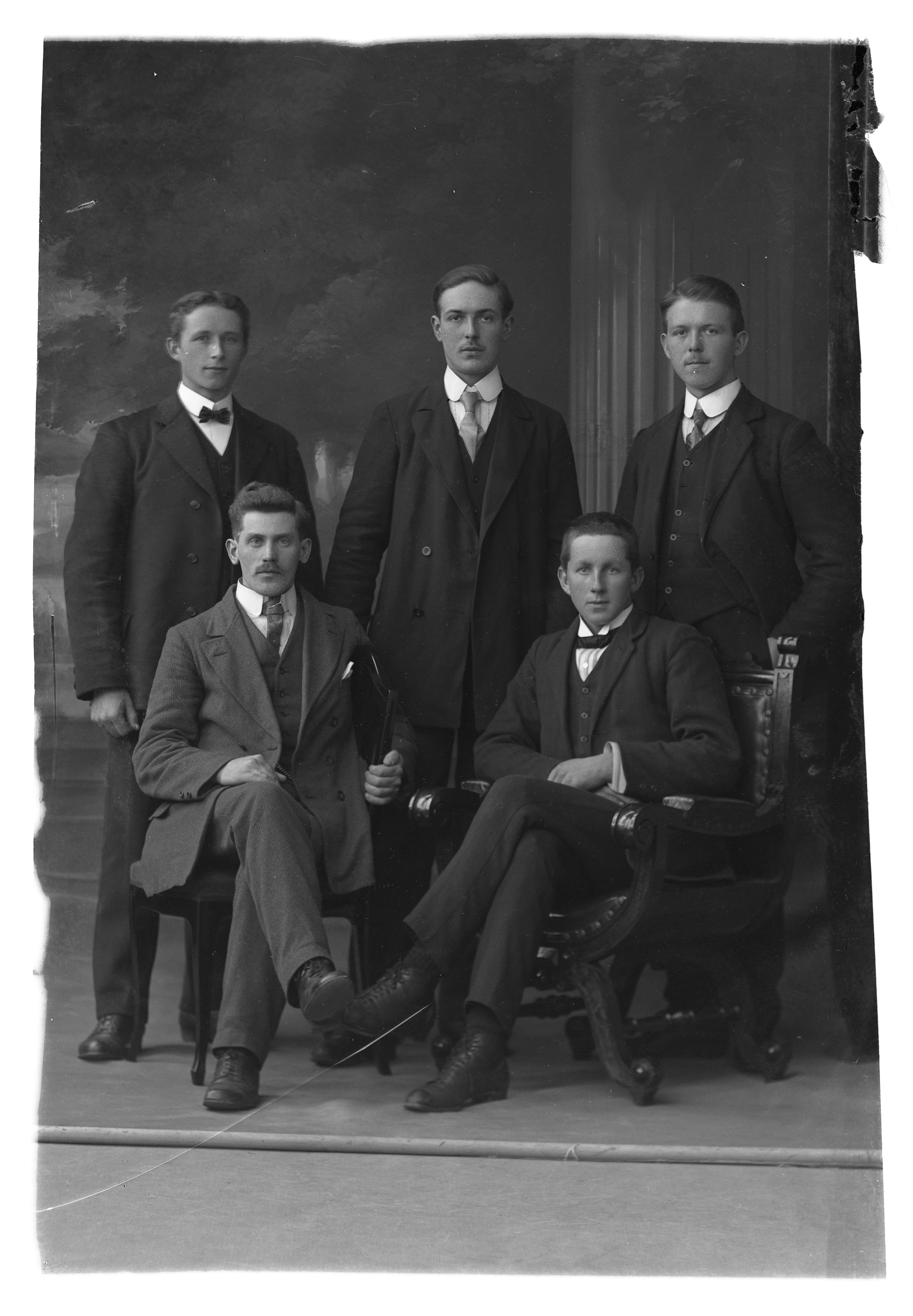Porträtt i helfigur av Karl Johansson med okänt sällskap, sittande och stående. Ateljéfond med pelarmotiv i bakgrunden.