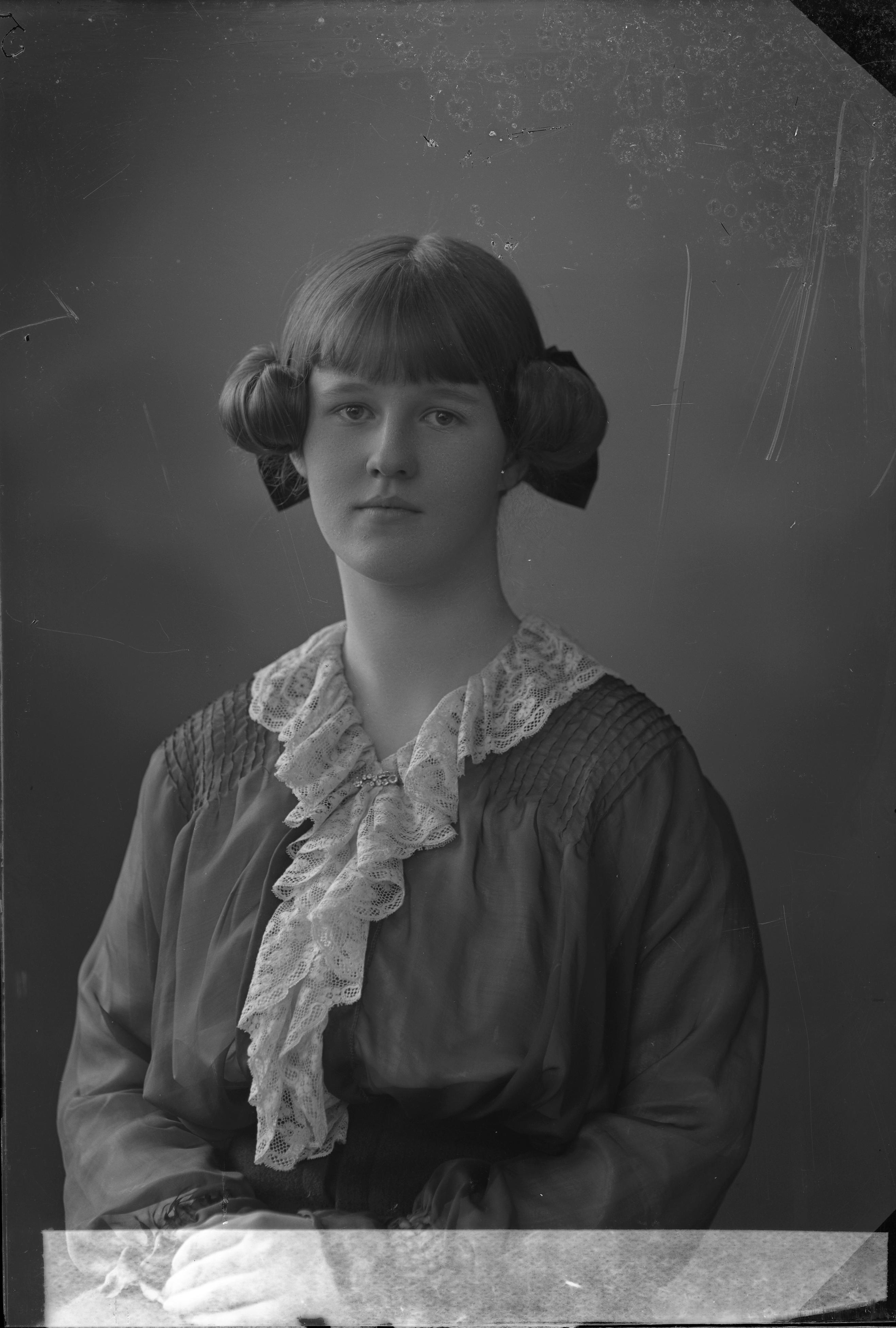 Beskrivning: Porträtt i halvfigur av fröken Blixen-Finecke med stor rosett i nacken.