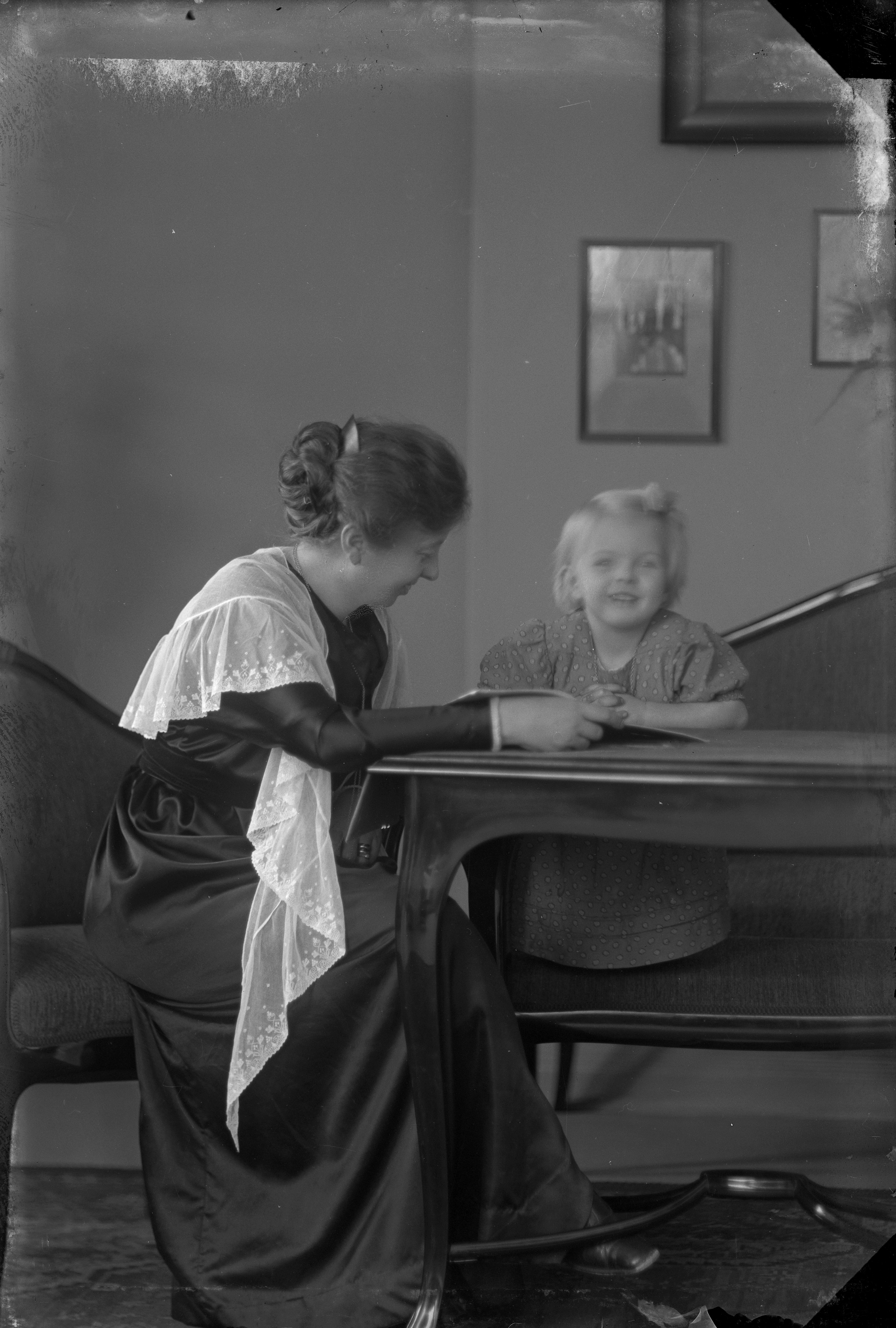Porträtt i helfigur av Malin Ingers, sittande vid bord med sin dotter.