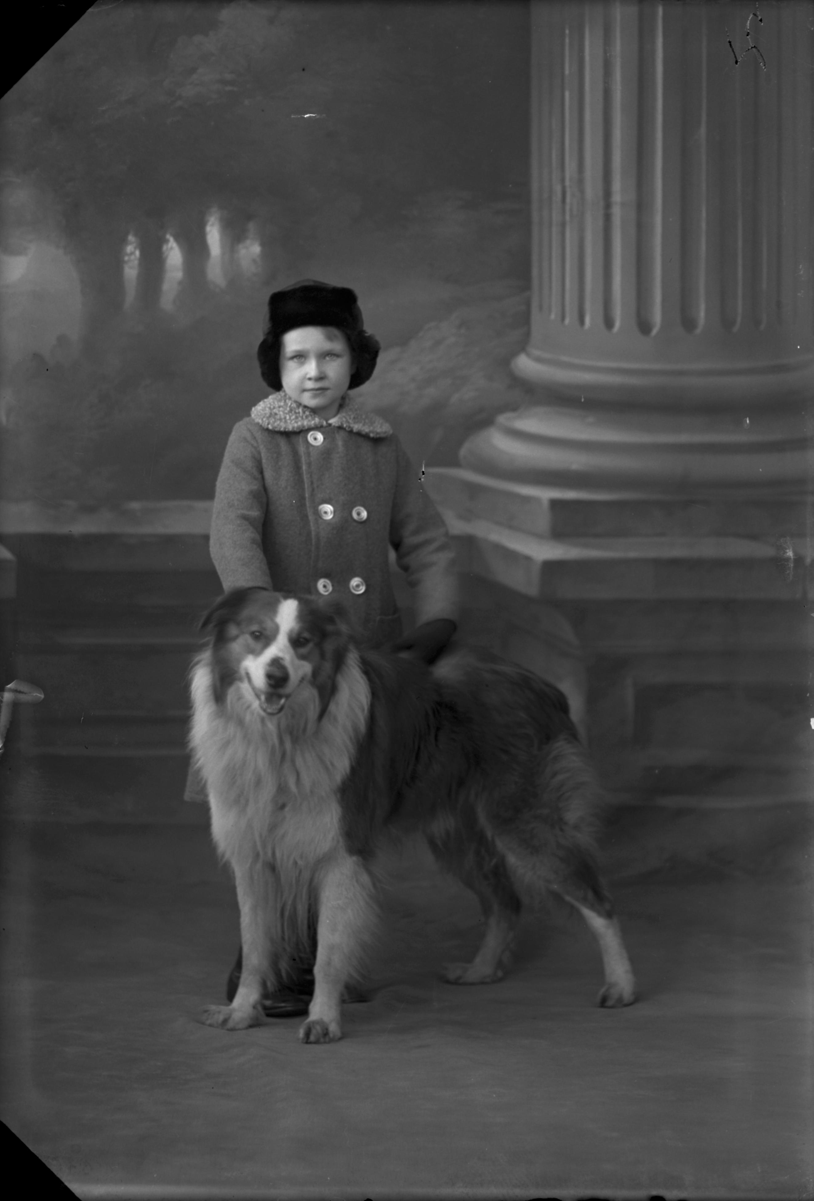 Porträtt i helfigur av fru Brands barn i mössa och ytterkläder, tillsammans med sin hund. Atlejéfond med pelarmotiv utgör bakgrunden.