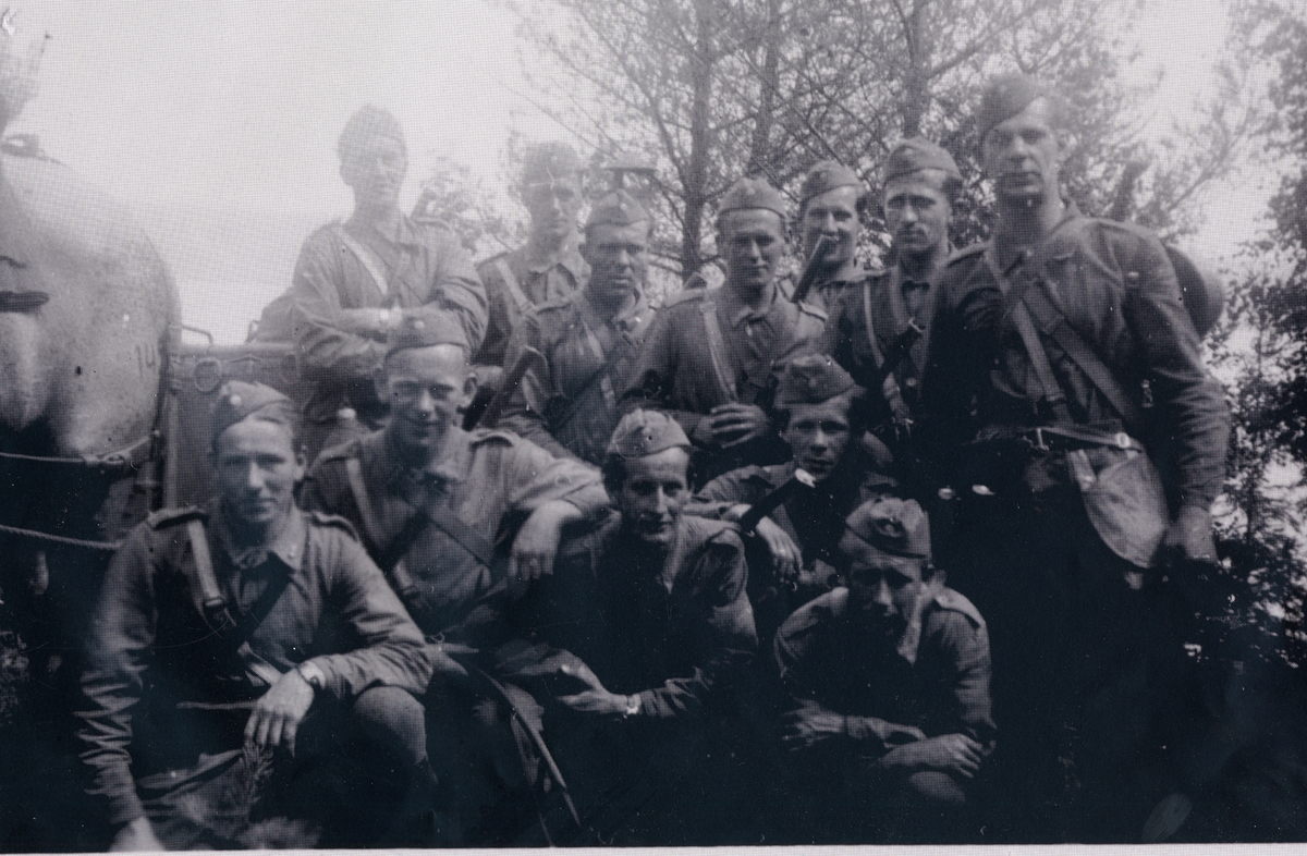 Grupp beväpnad med karbiner poserar vid en klövjad häst, Värmland 1943.