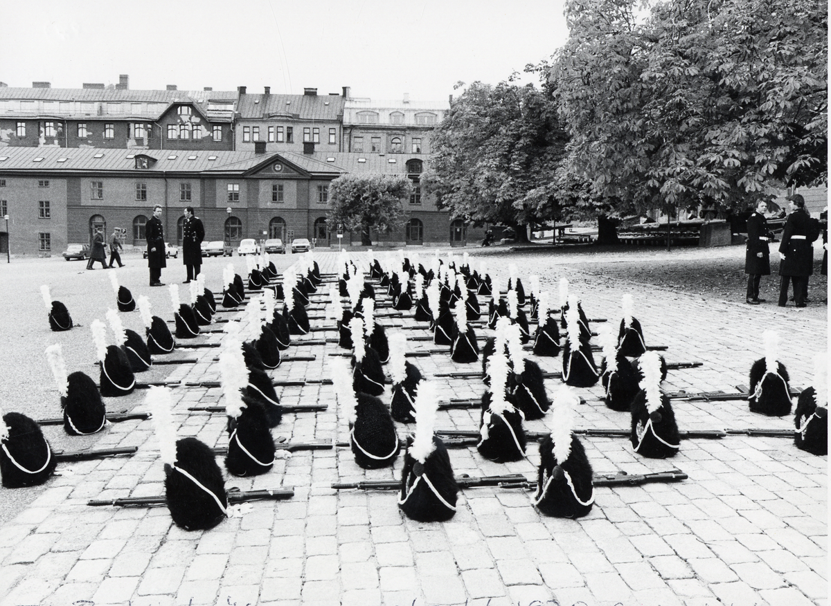 Grenadjärvakten Svea livgarde i björnskinnsmössor och beväpnade med AK 4 väntar på Artillerigården inför riksdagens öppnande, 1978.
