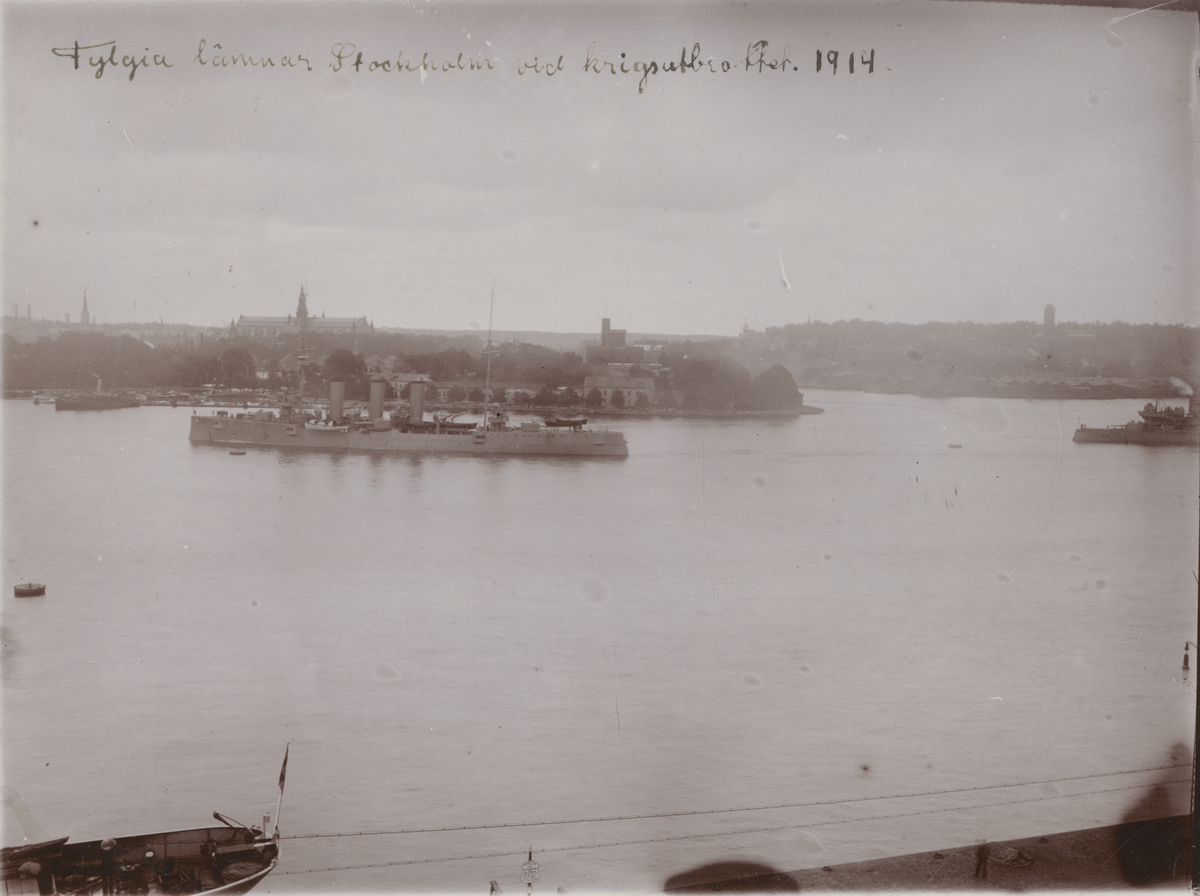 Titel: Kryssaren Fylgia lämnar Stockholm vid krigsutbrottet 1914.