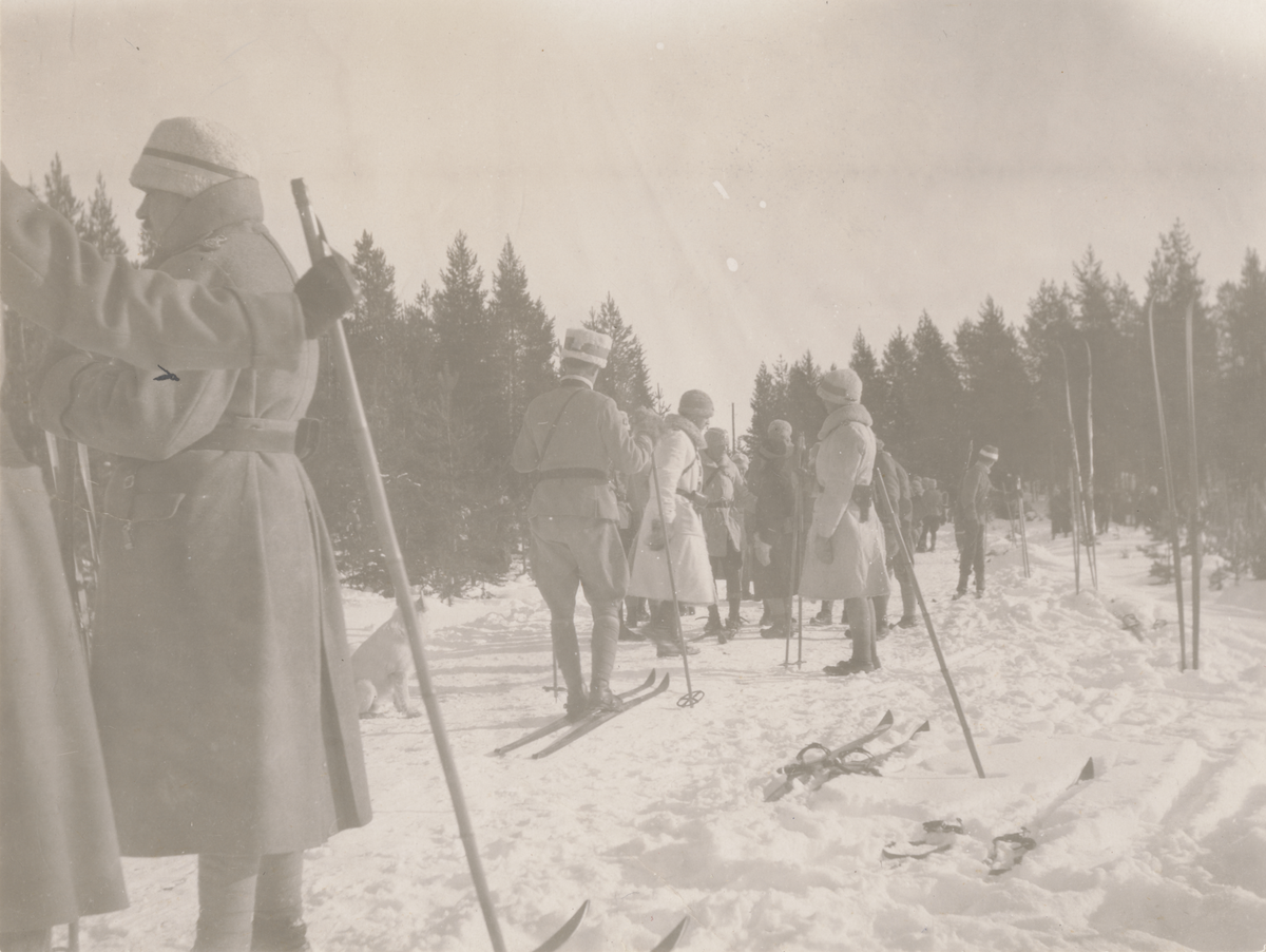 Titel: Vinterövningar på 1940-talet. Trupp på skidor rastar i skog.