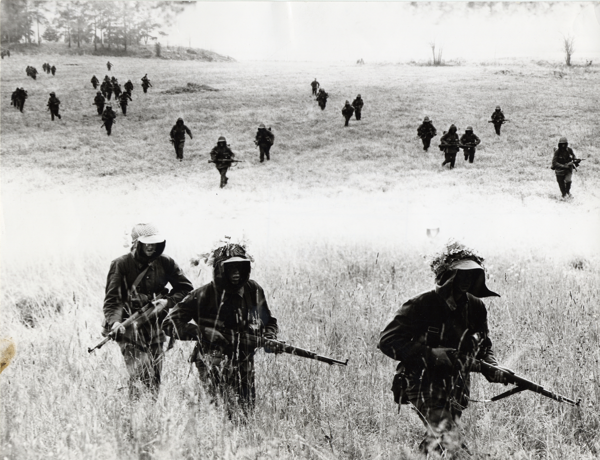 Titel: Soldater beväpnade med Mausergevär går över ett rökfyllt fält.