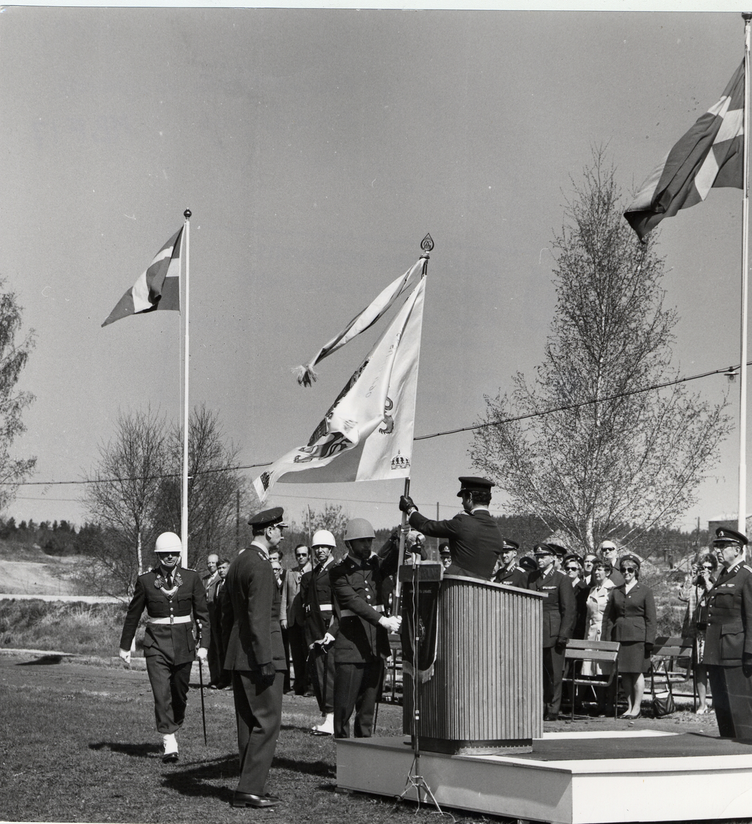Titel: Fanöverlämning P 1 Göta livgarde, Enköping. Kungen Karl XVI Gustaf överlämnar fanan, 1975.