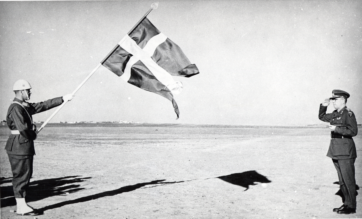 Fanvakt i Gaza Kung Gustaf VI Adolf hälsar på fanan i ett ökenlandskap, 1960-tal.