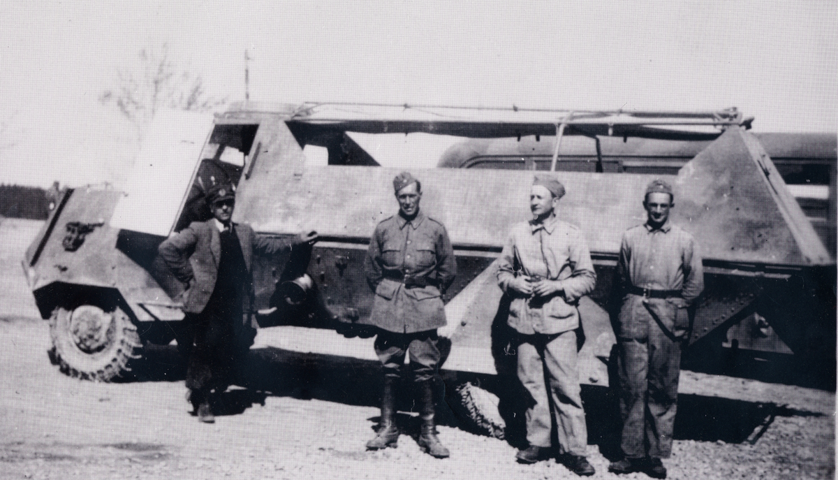 Fyra män, varav tre militära, poserar framför en KP-bil.