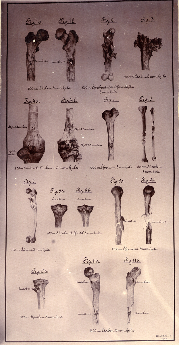 Anatomiplansch med bilder på lår-, sken- och överarmsben som skjutits med 5 och 8 mm kulor på olika avstånd.