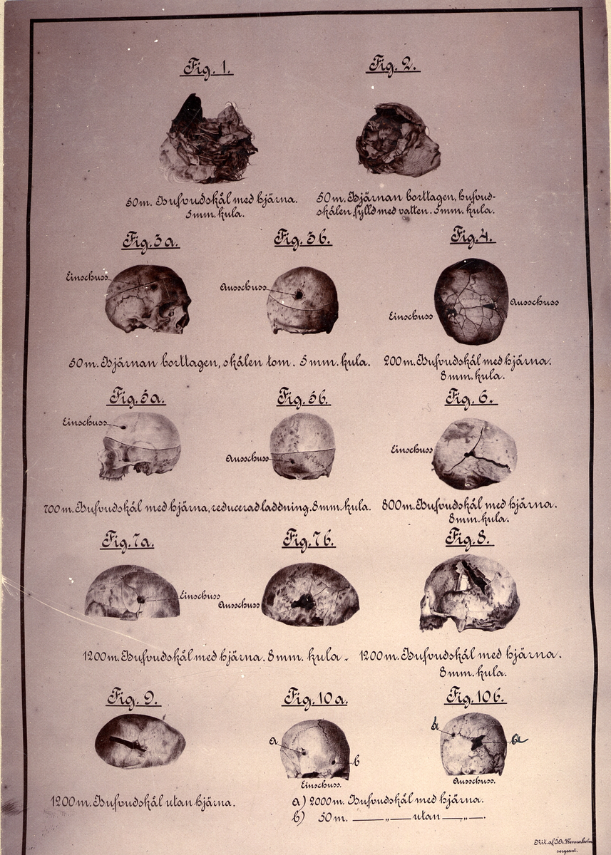 Titel: Anatomiplansch med bilder på lårben och överarmsben som skjutits med 5 och 8 mm kulor på olika avstånd.