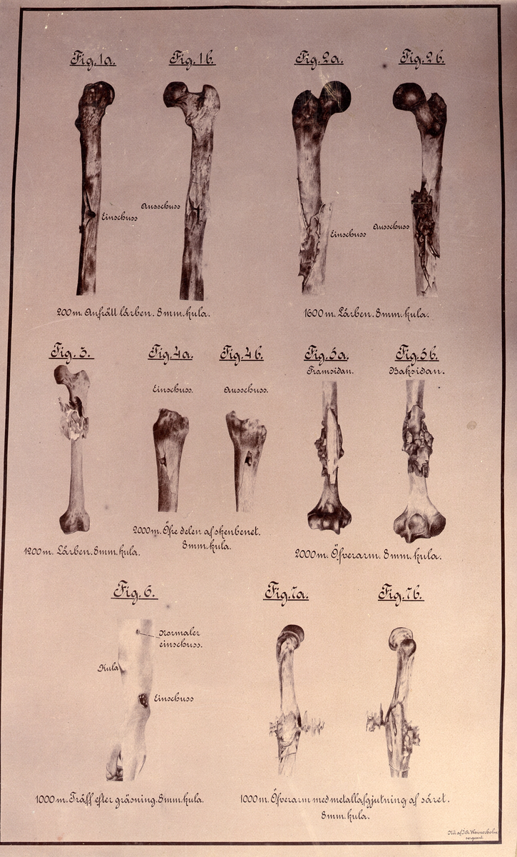 Anatomiplansch med bilder på lår-, sken- och överarmsben som skjutits med 5 och 8 mm kulor på olika avstånd.