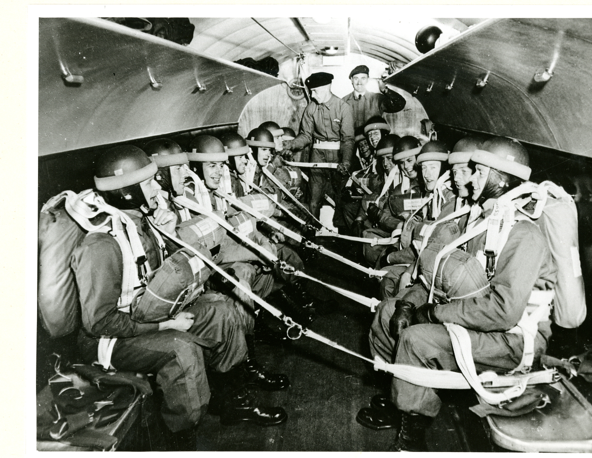 Titel: Fallskärmsjägare sitter i transportflygplan Tp 79 Douglas Dakota (C-47).