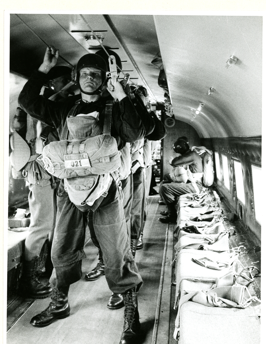 Titel: Fallskärmsjägare före hopp från transportflygplan Tp 79 Douglas Dakota (C-47).
