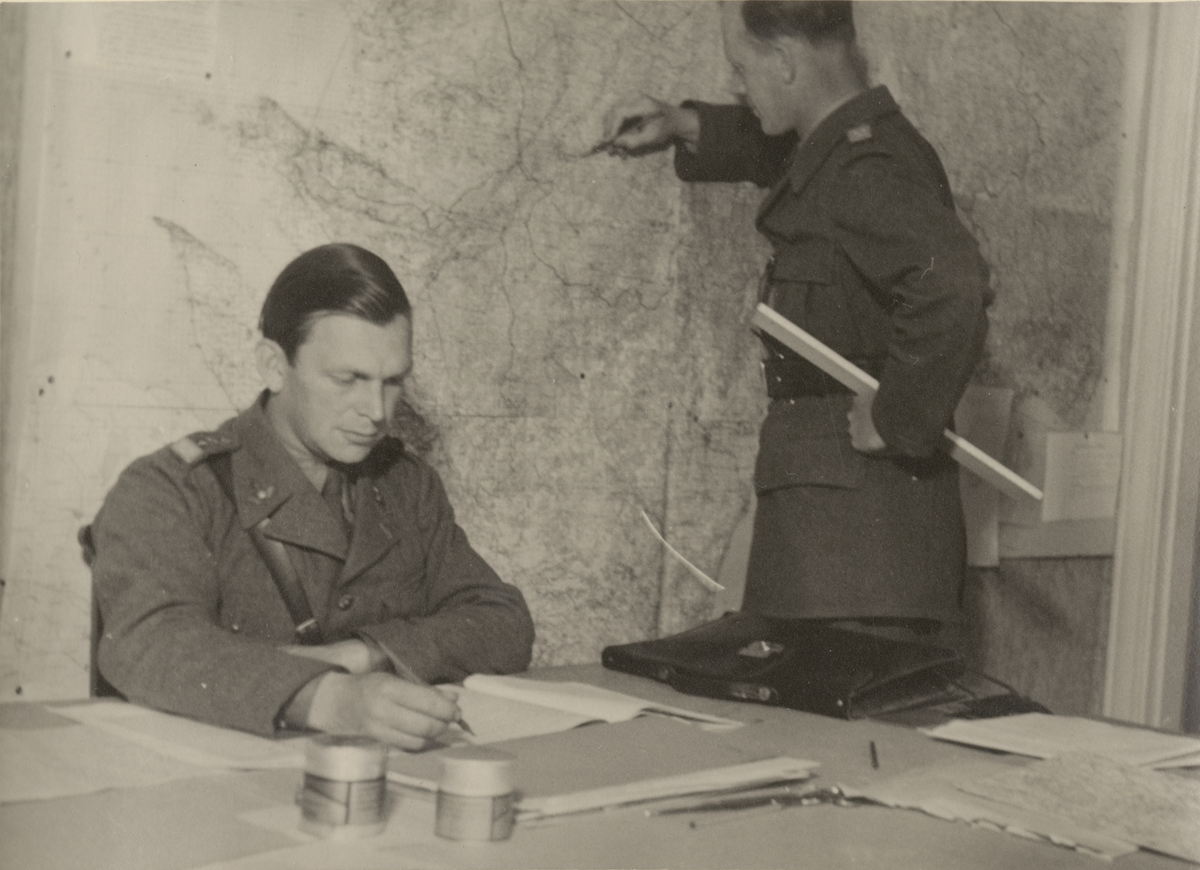 Löjtnant vid luftvärnet läser vid skrivbord, en annan står vid en väggkarta, uniform m/1939.