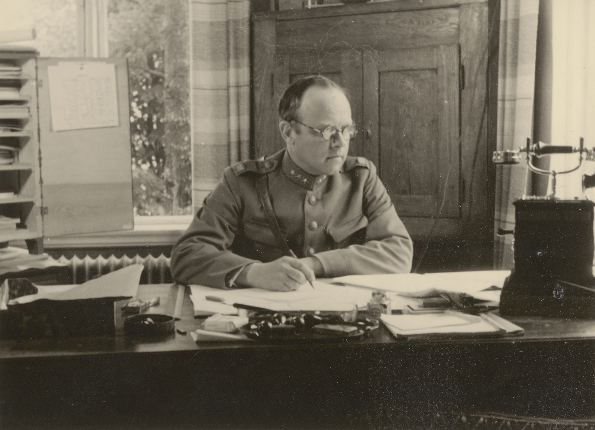 Kapten vid skrivbord med telefon, expeditionstjänst, uniform m/1939.
