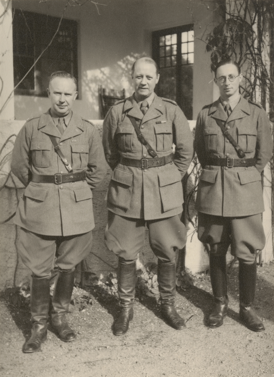 Tre officerare i ridbyxor utanför hus, uniform m/1939.