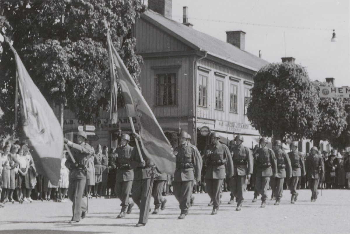 Marsch genom stad med fanor i spetsen, uniform m/1939.
